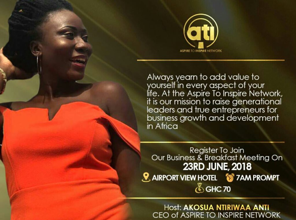 <p><b>ASPIRE TO INSPIRE NETWORK </b> is looking foward to it&#8217;s second edition of their breakfast meeting slated for Saturday 23rd June 2018 at the airport view hotel. The maiden edition saw speakers like Miss Salomey Davor, Miss Rosemary Konadu and Miss Akosua Ntiriwaa Anti the host with the theme<strong> “DARE TO DARE YOURSELF”</strong> daring young women to leave their comfort zones to break the glass ceilings.</p>